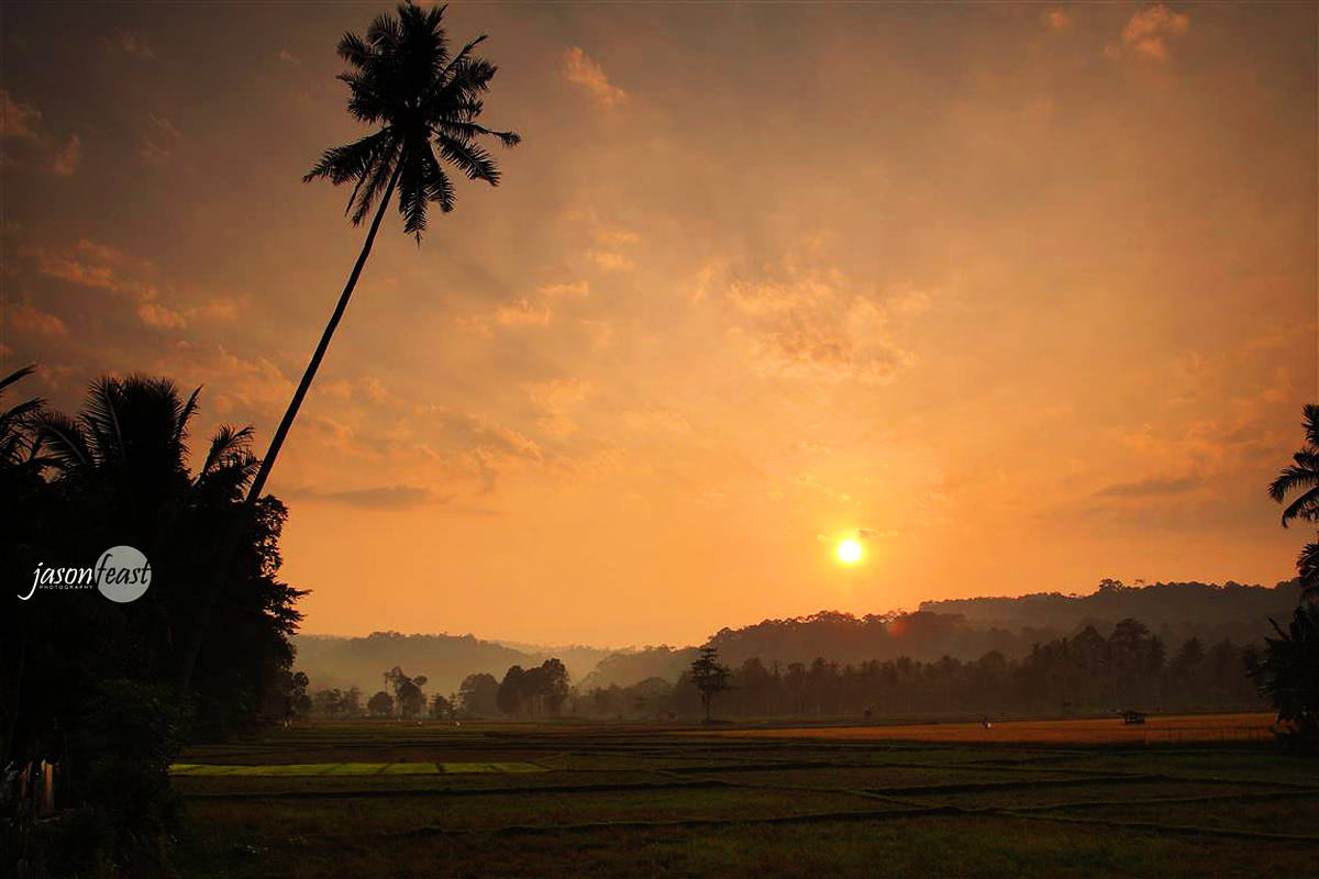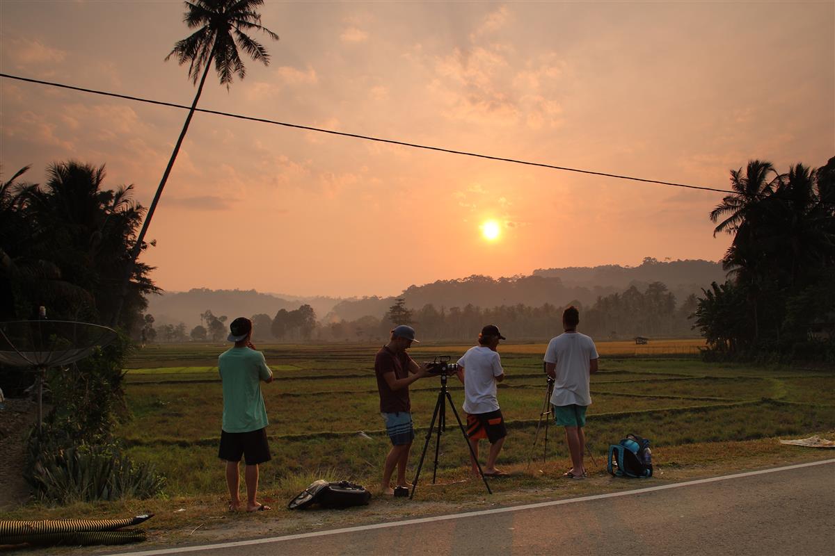 Production crew enjoying an Indonesian Sunrise while flying the drone over the paddy fields.